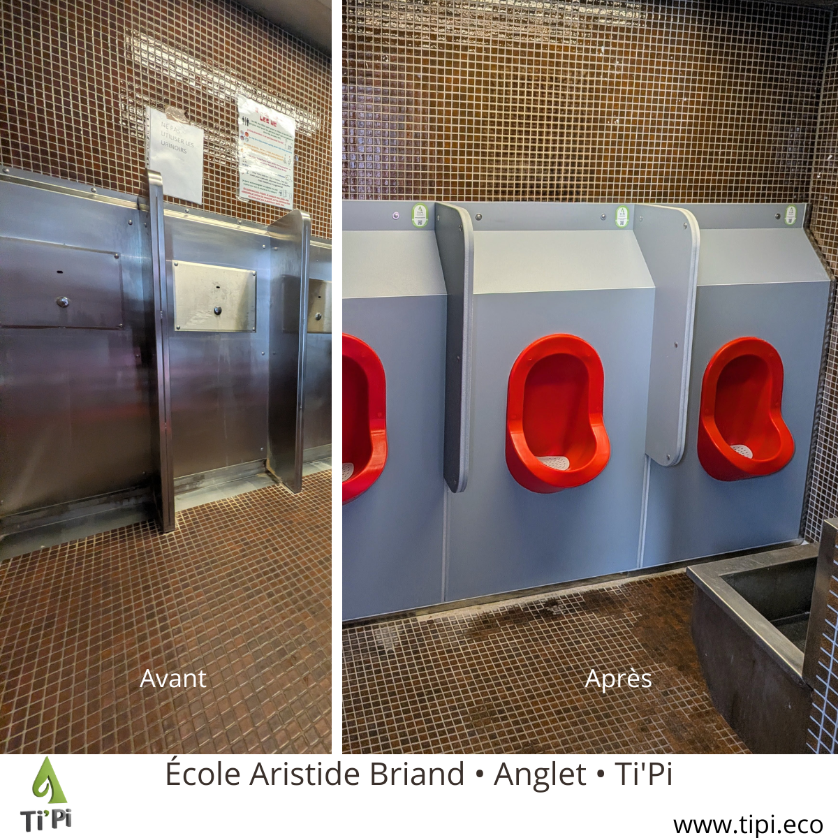 📍 D’un panneau “NE PAS UTILISER LES URINOIRS” à une installation moderne, écologique et rentable. Voilà le résumé de ce que nous venons de réaliser avec les services techniques de la Ville d’Anglet, à l’école Aristide Briand. Trois urinoirs en inox vétustes, hors service depuis trop longtemps, ont laissé place à 3 urinoirs sans eau 𝗧𝗶’𝗣𝗶, rouge vif sur mobilier anti graffiti gris, propres, fonctionnels, esthétiques. Et surtout : intelligents économiquement. 𝗖𝗲 𝗾𝘂𝗲 𝗰𝗲𝘁𝘁𝗲 𝗶𝗻𝘀𝘁𝗮𝗹𝗹𝗮𝘁𝗶𝗼𝗻 𝗿𝗲𝗽𝗿𝗲́𝘀𝗲𝗻𝘁𝗲 𝗰𝗼𝗻𝗰𝗿𝗲̀𝘁𝗲𝗺𝗲𝗻𝘁 𝗽𝗼𝘂𝗿 𝗹𝗮 𝗰𝗼𝗹𝗹𝗲𝗰𝘁𝗶𝘃𝗶𝘁𝗲́ : Un urinoir classique consomme entre 1 et 3 litres d’eau par utilisation. Avec 3 urinoirs sans eau dans une école, les économies générées sur la facture d’eau sont immédiates, mesurables et cumulatives. Résultat : l’investissement s’autofinance intégralement grâce aux économies d’eau réalisées année après année. Et une fois le retour sur investissement atteint — chaque passage aux toilettes d’un élève devient une économie nette pour l’école, donc pour la Ville d’Anglet. Pas une fois. Pas deux fois. À chaque utilisation, indéfiniment. C’est ce que nous appelons un investissement à rendement perpétuel : on dépense une fois, on économise pour toujours. Nos urinoirs fonctionnent sans eau, sans odeur, sans contact, incassables et 100 % recyclables. Fabriqués au Pays Basque, dans notre atelier de Saint-Jean-de-Luz. Un grand merci aux services techniques de la Ville d’Anglet pour leur confiance renouvelée. C’est en travaillant main dans la main avec des collectivités engagées que l’on bâtit des territoires plus durables.