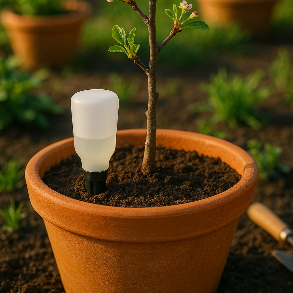 – Une bouteille de 600ml avec indicateur de dosage : la bouteille est suffisamment rigide pour se déformer peu et pousser au maximum l’urine vers la plante.