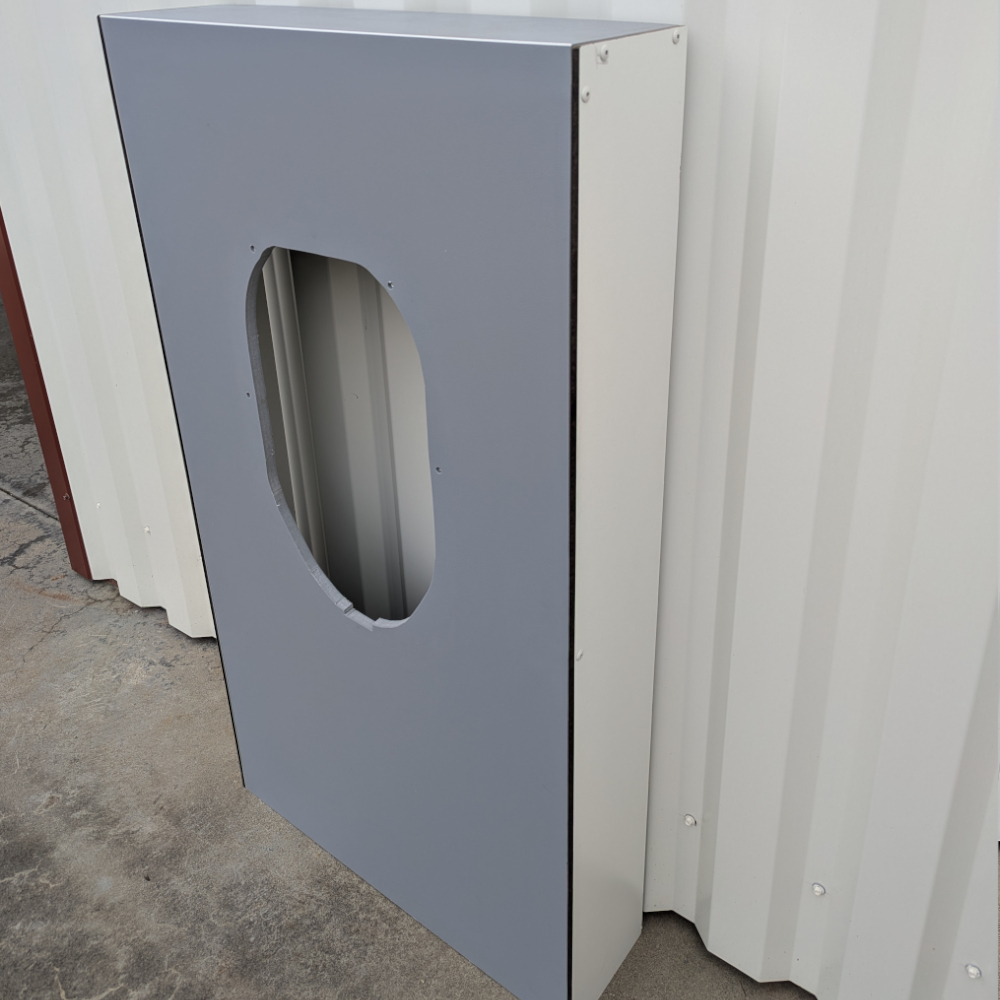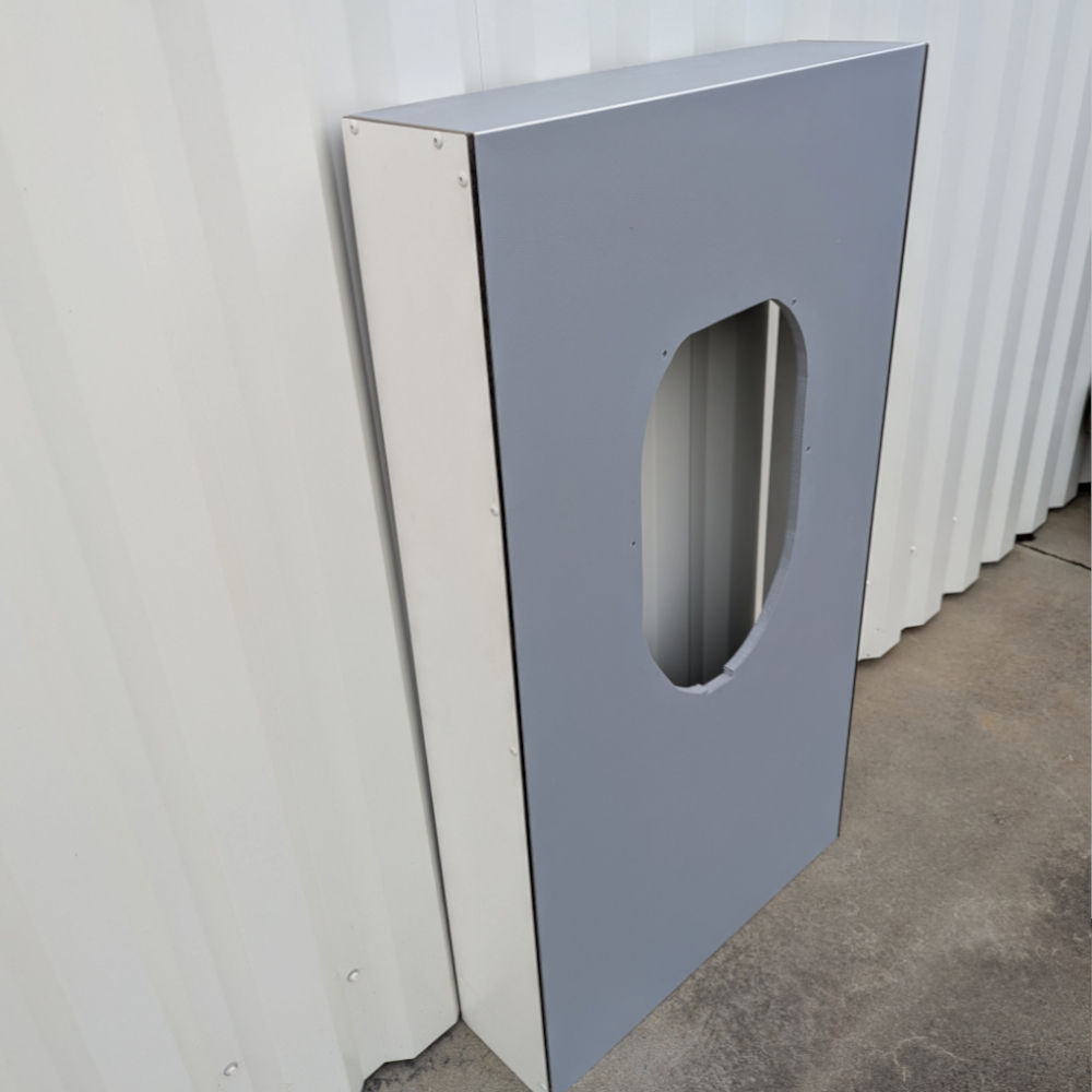 La face avant est en polypropylène expansé gris et les côtés sont en stratifié compact.